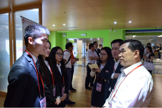 随后,焦方太一行在各部门负责人等领导的陪同下先后参观了广交会各个学生实习点。首先,焦方太前往B区VIP境外贵宾俱乐部,与国际联络部的同学进行密切交流,来自经贸学院的黄荣国同学说道:“我们平时会跟外商聊天,除了询问商品信息之外,他们会分享以往的有趣经历,甚至还会谈人生谈理想。”当得知来过广交会的采购商10次以上达5万人次, 15次以上达3万人次时,焦方太表示非常惊讶。工作人员介绍说:“采购商来广交会的频率就像候鸟迁徙一样,逢春秋就过来广州过节。这些从世界各地慕名而来的采购商也是广交会最宝贵的财富。”