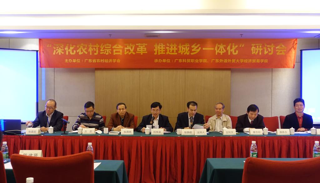 11月23日上午,由广东省农村经济学会主办、由广东科贸职业学院和广东外语外贸大学经济贸易学院承办的“深化农村综合改革 推进城乡一体化”研讨会在广东外语外贸大学国际会议中心举行。何传添副校长、张建武院长、广东科贸职业学院党委书记耿静超、广东省农业经济的专家学者、我院教师代表等60多人出席。学会会长耿静超主持会议。