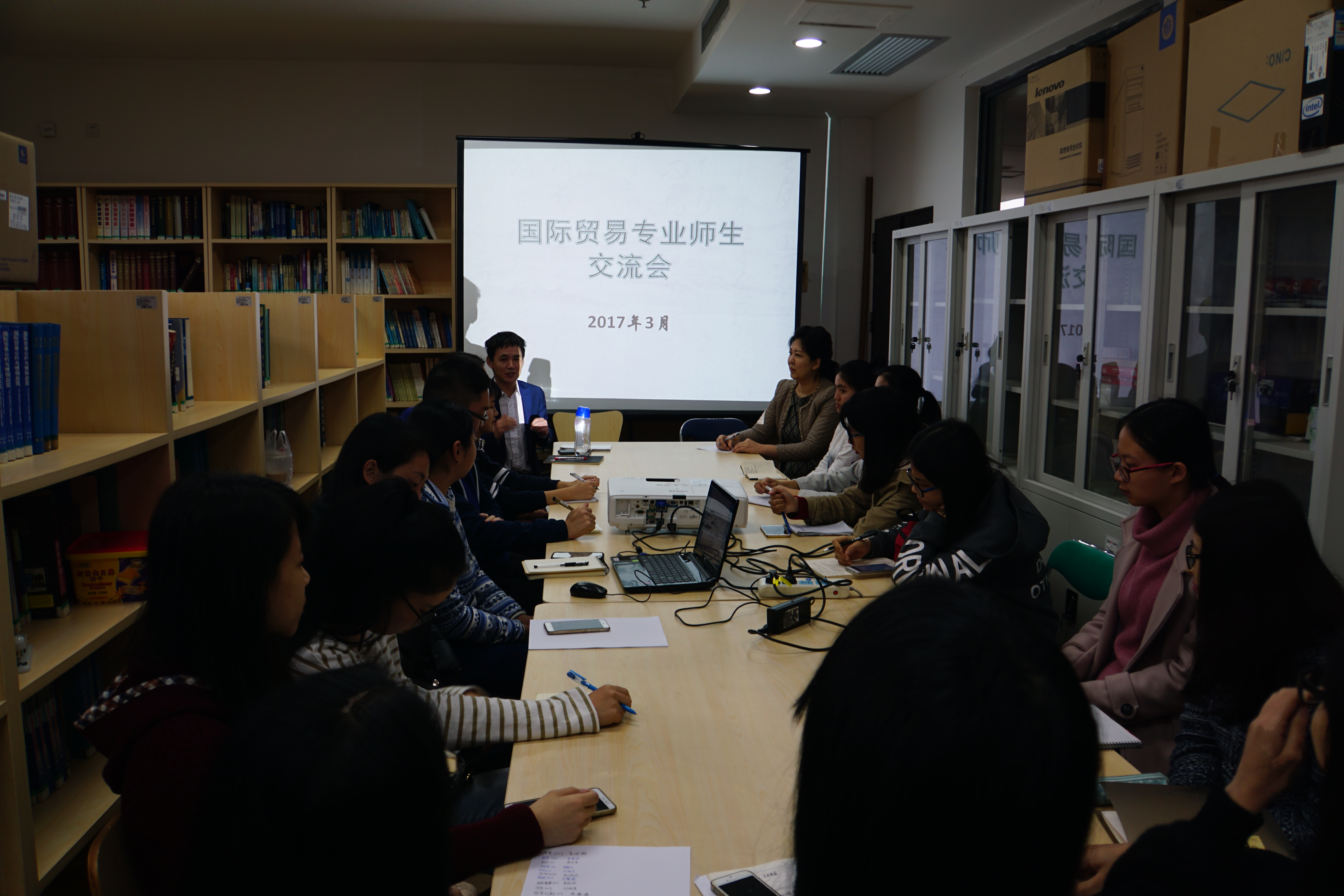 2017年3月16日下午,国贸系师生交流会于院系办公楼召开。经贸学院教学副院长魏章进院长,国贸系系主任冯然老师、专业教师田云华老师、教务办汤智清老师,以及国贸专业所有班级的学习委员参加了本次交流会。此次交流会的召开,旨在了解同学们目前专业学习情况和感受,尽力解决同学们专业学习中遇到的问题。