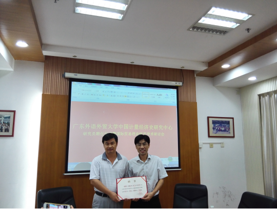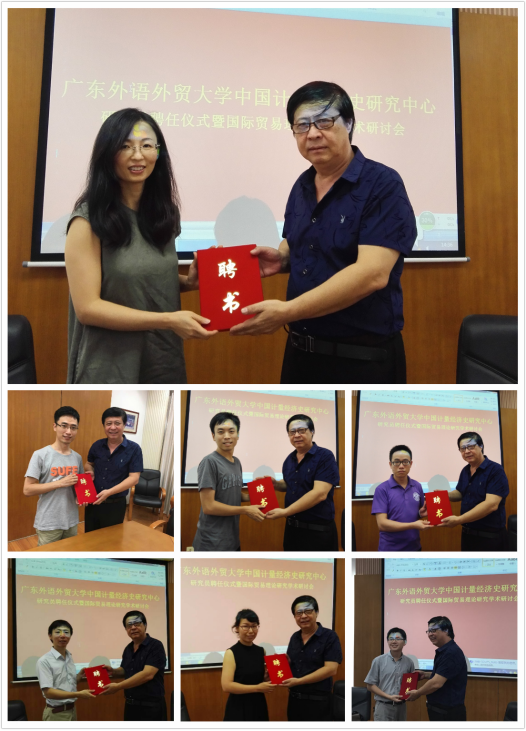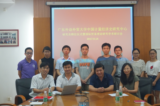 2017年9月14日14:30-17:30,广东外语外贸大学中国计量经济史研究中心全体成员在院系办公楼301会议室举办研究员聘任仪式,聘任仪式由陈昭教授主持,并为齐瑞福博士颁发研究员聘书,刘巍教授为戴艳娟副教授、林友宏博士、郭永钦博士、陈川博士、林彦樱博士、徐芳燕博士和周迪博士颁发研究员聘书。