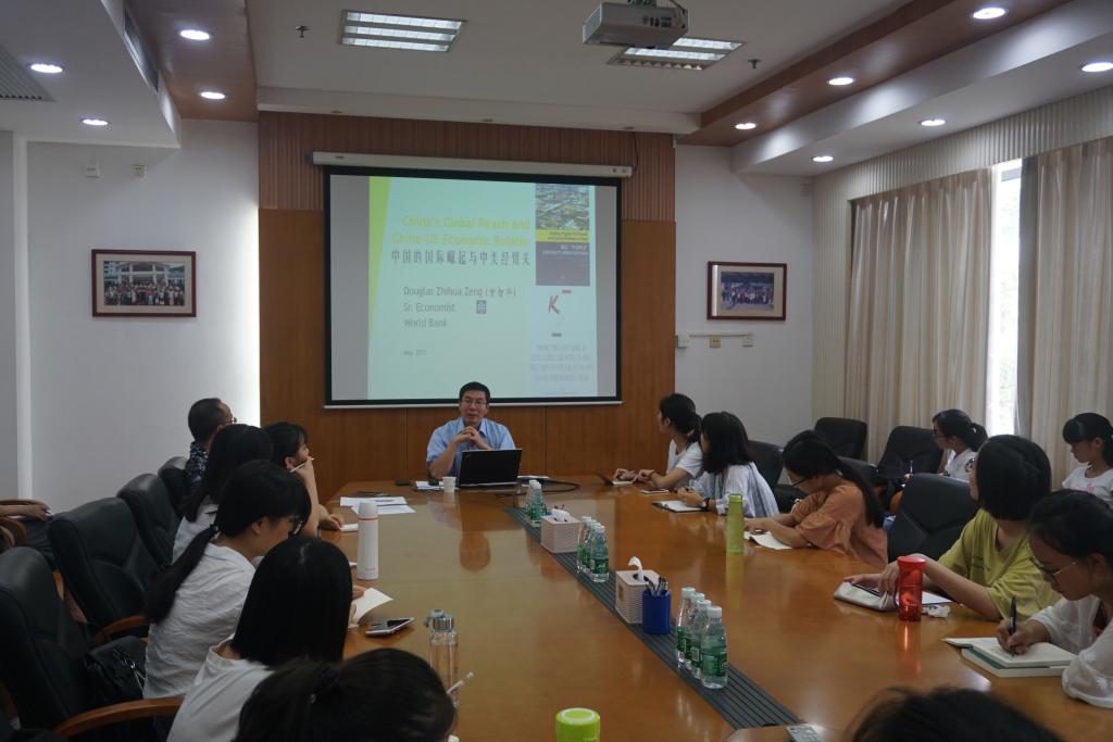 2017年9月21日14:30—16:30,广东外语外贸大学经济贸易学院2017第十期讲座“中国的国际崛起与中美经贸关系”,在院系办公楼301室举行。讲座由广东外语外贸大学经济贸易学院肖奎喜副院长主持,世界银行高级经济学家、宏观经济、产业政策(经济特区、开发区、产业集群\价值链)、国际投资、技术创新及新经济方面的国际知名专家,世界银行“知识与发展”项目创始人之一的曾智华教授主讲。