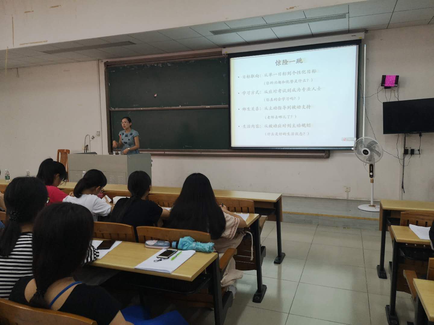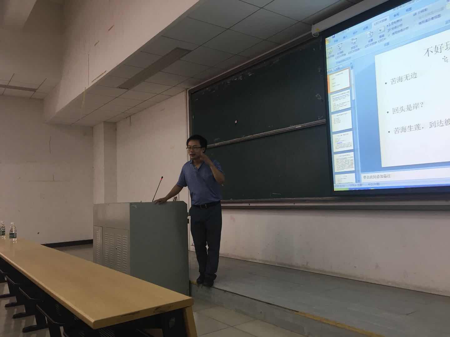 在一片热烈的掌声中,安苑老师结束了财政学专业的介绍分享,刘明勋老师上台介绍税收学专业。与安苑老师温情的讲解方式不同,刘明勋老师的介绍则更加诙谐,一开始的导语标题就吸引了新生们的注意力。在接下来的专业介绍中,刘明勋老师先向大家简单介绍了税收学专业优秀的师资队伍,接着给众新生们亮出了他们各自班级对应的本科生导师。会议有条不紊地进行着,刘明勋老师对新生们提出了几点建议:首先,每个人都应该做一份作业,作业内容是一份简历、一份大学四年的规划、阅读经管法书籍;第二,以学习为主兼顾其他,鼓励新生们适当参社团活动;最后,积极考证以及不要虚度假期。