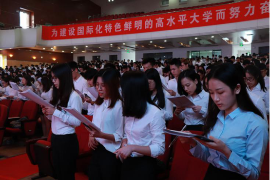 接着第124届广交会实习学生代表李俊玥也分享了她对广交会的看法,她认为此次实习的最大意义是实习迫使角色的转换,成为工作任务的安排者,也改善了日常生活习惯,拓宽了思维视野。而后,她带领全体实习生宣读了第124届广交会实习上岗承诺书。