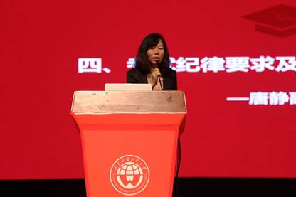 大会最后,经贸学院副院长唐静老师上台对考试纪律要求及寒假安全问题做总结。她再次提醒同学们不要触碰考试底线、坚持诚信应考并仔细阅读考试纪律要求,同时衷心祝愿各位同学能过一个愉快的假期并安全返校。