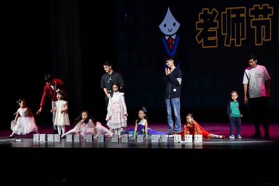 合唱落幕,模特队四位英俊帅气的同学带着孩子们一起走上舞台,为接下来的老师节目预热。走秀结束,八位可爱的小朋友们一起在舞台上劈起了横叉,引得台下的同学们尖叫连连。
