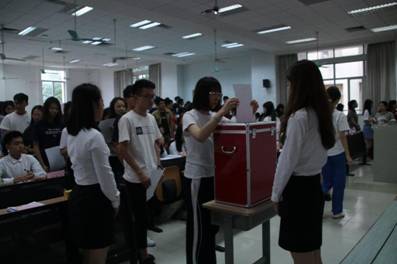 随后,23位委员候选人逐一上台发表各具特色的竞选演讲。除了自我介绍外,他们的演讲有对这一年的回顾,有对各自部门归属感的感慨,也有自己对接下来对部门、对团学的展望。他们带着坚定的目标,怀着满怀的信心,在讲台上立下对同学、对团学的承诺。在观看了精彩纷呈的竞选演讲结束后,学生代表们将经自己慎重考虑后填写的选票投到了已受检查的投票箱中,为他们心目中合适的候选人投下了自己神圣的一票。第一次投票结束后,产生了团委书记、团委副书记及其他团委委员和学生会委员名单。