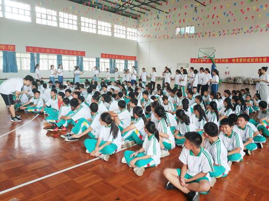 上午8点30分,“情之程”全体队员与同学们举行了见面会。其中担任各班班导的队员给同学们进行了简短的自我介绍,并带领他们观看了我校与我方全体队员的介绍视频。随后,全体队员带领同学们在体育馆进行了一系列趣味小游戏,如“我是数字王”、“你踩雷了吗”等。最后,队员们对全体同学派发了明信片纪念品,并给游戏中得分较高的小组派发了小礼品作为奖励。