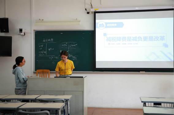 座谈会主要分为三个环节,第一个环节由七个小组通过制作PPT分别展示他们对“减税降费”政策实施的理解。展示完毕后,由后一组同学对前一组展示内容进行了点评及提问。