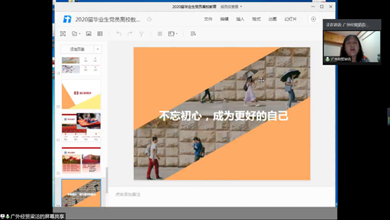 梁洁书记带领大家回顾了进入广外的第一刻,从广外的创办之初、校训开始与大家一起交流探讨。接着,梁洁书记介绍了最美广外人广州外国语学院院长饶彰风以及广外第一任校长黄建华教授对广外做出的贡献。随后,梁洁书记从大家共同的起点——经济贸易学院入手,介绍了经贸学院从1956年到2014年的改变,又结合当下的新冠疫情,提到了许燕戈、祖力比努尔-亚森、孙英男等在疫情期间为社会做出奉献的经贸学院学生党员们。