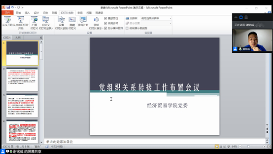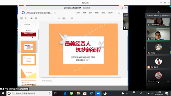 为了更好地做好毕业生党员的离校教育工作以及党组织关系转接工作,广外经济贸易学院于6月13日晚八点在腾讯会议上召开了2020届毕业生党员离校教育暨组织关系转接工作布置会议,学院党委书记、副书记、毕业班辅导员、全体2020届毕业生党员出席了本次会议,会议由经贸学院党委组织员谢铭威老师主持。