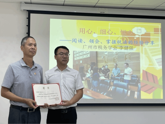讲座初始,张志明副院长为李健强会长颁发MT校外导师聘书。李会长在广州市税务机关工作数十载,先后成为广东省多所高校财税专业的校外导师,具有十分丰富的财税理论知识及行业从业经验。