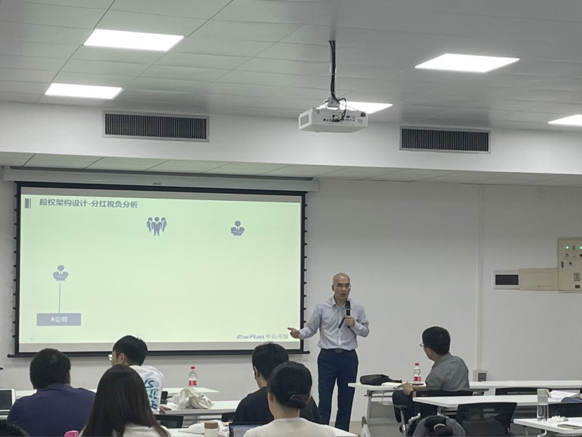 紧接着,黄驰老师介绍了广东某科创板上市公司的案例,引入了股权架构设计的内容,如持股方式、股东法律形式、股东分类、责任风险及管理决策等,从企业及个人税负的角度切入,与同学们探讨了股权架构设计中的各类税收问题,使同学们受益匪浅。