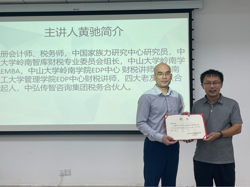 讲座正式开始之前,刘明勋主任为黄驰老师颁发校外导师聘书,黄驰老师是我国注册会计师、税务师,四大会计师事务所老友会的联合发起人之一,于中山大学、华南理工大学等知名高校均有讲授经历,具有十分丰富的从业及授课经验。