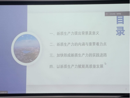 讲座伊始,耿晔强教授简要介绍了新质生产力的背景与意义。自2023年9月以来,习近平总书记多次提到新质生产力,强调其深刻的理论和现实基础。耿教授指出,新质生产力在特定时空背景下诞生,如西方科技霸权的制约和民族复兴的需求,虽然形成时间不长,但已取得显著进展。随后,耿教授详细阐述了新质生产力的创新点,包括政府与市场关系的协调、高水平科技自立、科技创新体系的完善以及现代化产业体系的建设。他强调,加快形成新质生产力的关键在于提升科技创新力、建设现代产业体系和优先发展人才队伍。最后,耿教授指出,新质生产力对高质量发展的推动作用,包括实现技术革命性突破、优化生产要素配置、促进产业转型升级和加快绿色发展方式。