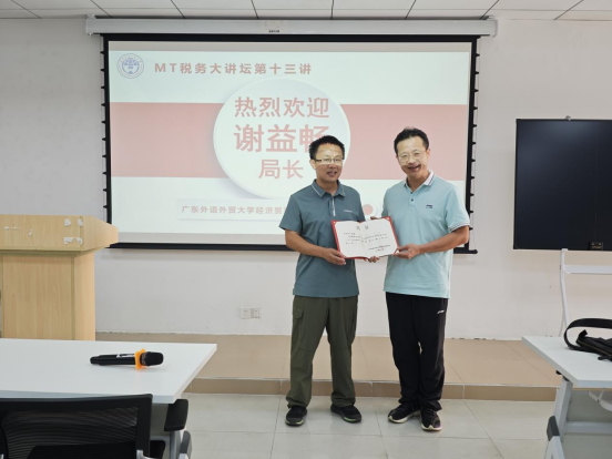 2024年11月7日下午,广东外语外贸大学经济贸易学院“MT税务大讲坛2024年第六讲”在我校南校区教学楼B210举行,谢益畅先生受邀莅临我院为学生开展以“智慧税务背景下的税务风险管理”为主题的讲座。出席本次讲座的还有我院税务专硕主任刘明勋副教授及税务专硕2024级全体学生。