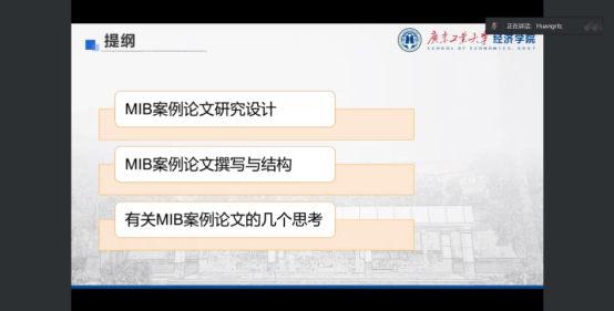 2024年12月20日晚,广东外语外贸大学经济贸易学院成功举办了MIB国际商务大讲坛2024年第八讲,此次活动以线上形式精彩呈现,黄荣斌受邀为我院学生开展以“有关MIB案例研究论文设计与撰写的个人思考”为主题的讲座。出席本次讲座的还有我院张志明教授及国际商务专硕2024级全体学生。