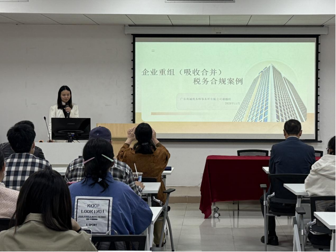 2025年11月27日下午,广东外语外贸大学经济贸易学院“MT税务大讲坛第十八讲暨 2025年第四讲”在我校南校区教学楼B210举行,范太平先生和王女士受邀莅临我院为学生开展了以“企业重组(吸收合并)税务合规案例分享”为主题的讲座。出席本次讲座的还有我院副院长许月丽教授、税务专硕主任刘明勋副教授、税务专硕2025级全体学生及本科生。