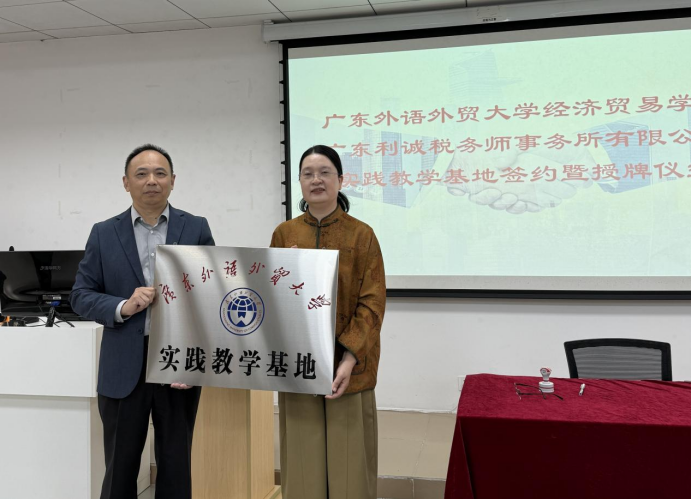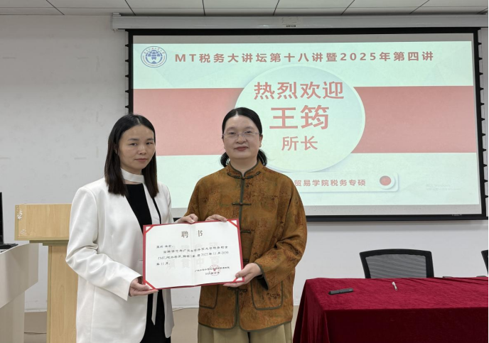 讲座正式开始之前,许月丽教授与范太平所长续签了广东外语外贸大学-广东利诚税务师事务所有限公司实践教学基地的签约本并授牌。接着,许月丽副院长向王筠女士颁发了经济贸易学院税务专硕校外导师的聘书。王筠女士,广东利诚税务师事务所有限公司合伙人,是国家税务总局“金税四期”项目特邀税务专家、中国注册会计师、税务师,具有丰富的税务实践经验。