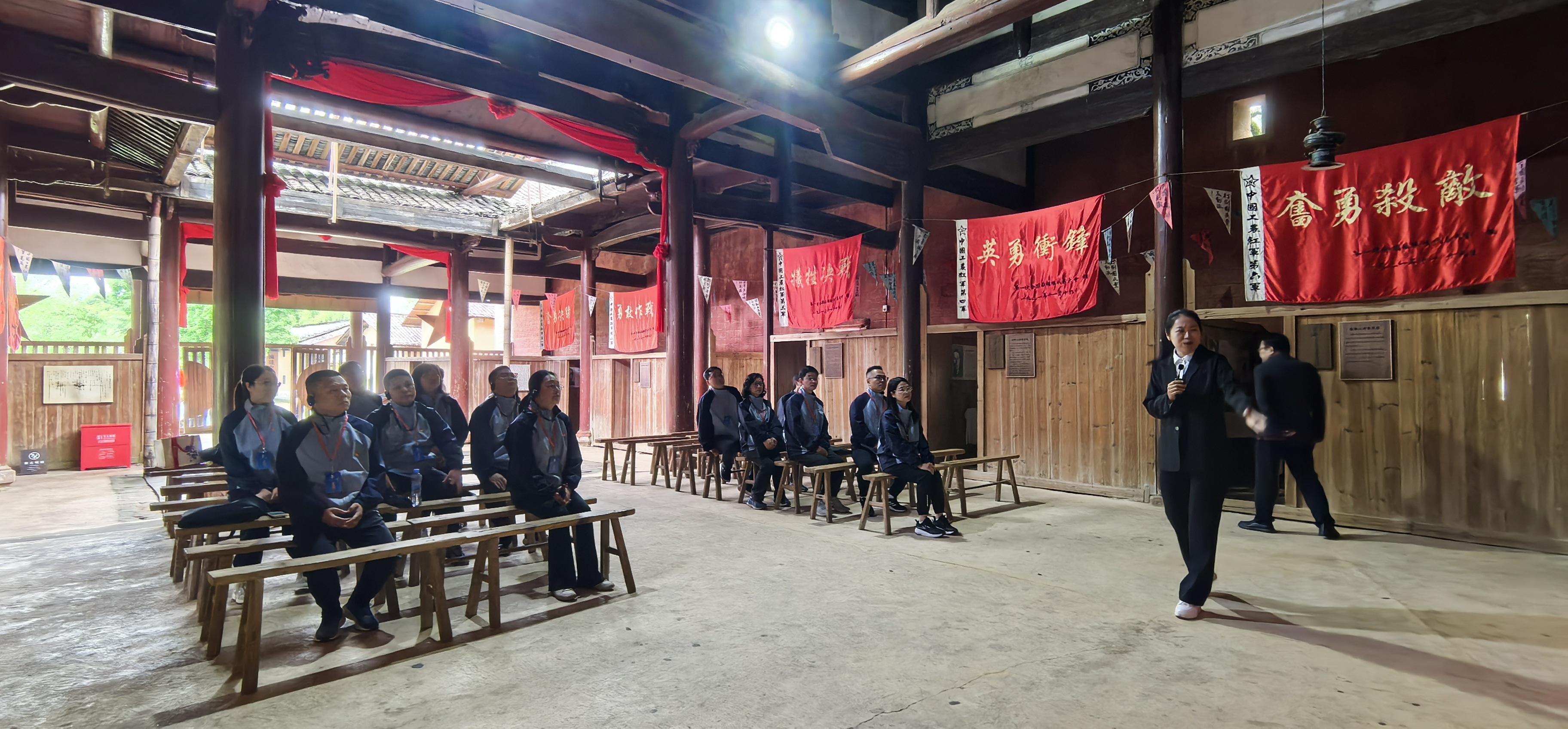 此行的第三站,是中共中央政治局旧址群。青砖黛瓦的中共中央政治局旧址看似一座寻常的客家民居,却是中国共产党人曾经运筹帷幄、指挥着全国苏维埃运动伟大实践的重要阵地。在这里,学员们进行《忠诚铸党魂》微党课学习,集体聆听老一辈无产阶级革命家在艰苦卓绝的斗争中始终保持对党忠诚的坚定信念,顽强拼搏、不畏困难的决心勇气,以及舍身忘我、宁为铺路人的崇高觉悟。习近平总书记强调,“对党忠诚,不是抽象的而是具体的,不是有条件的而是无条件的”,提醒着新时代党员干部牢记初心使命,胸怀伟大梦想,在缅怀革命先烈中传承红色基因,忠诚于党,严守纪律,积极开拓进取,勇于担当作为,攻坚克难,为党的事业披荆斩棘、开路架桥,跑好接力棒。
