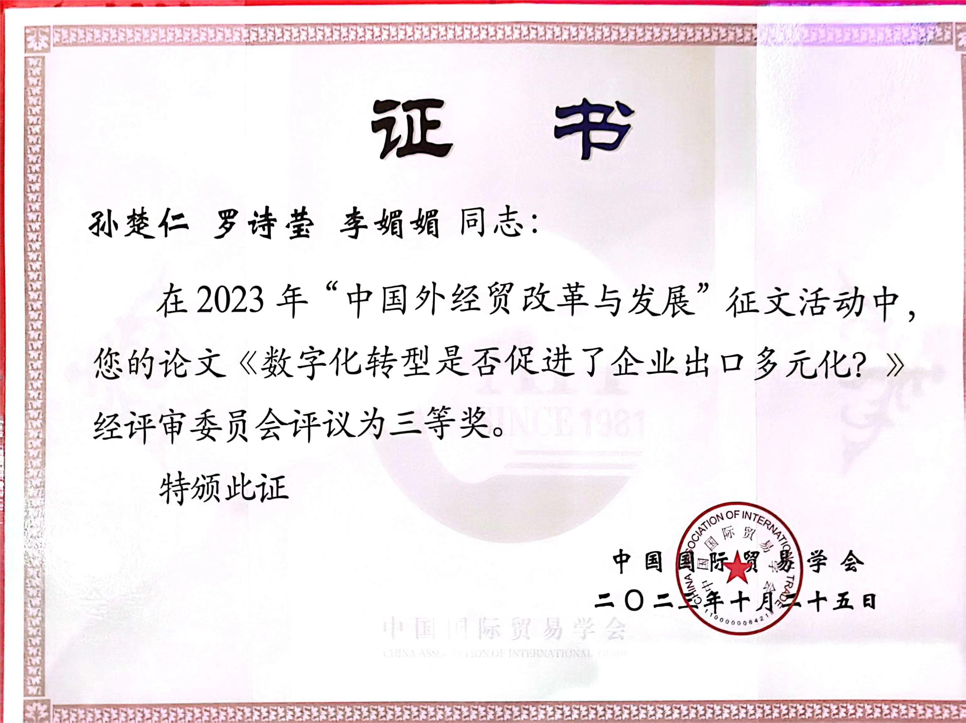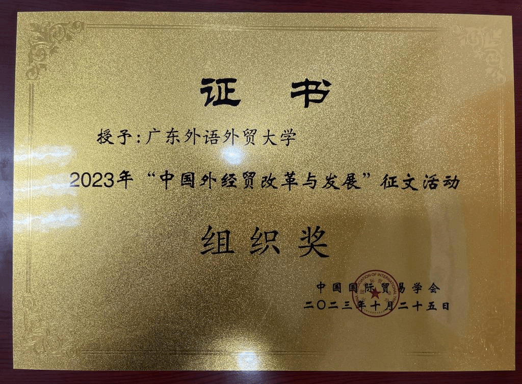 2023年11月24日至25日,由中国国际贸易学会和首都经济贸易大学共同主办的2023年中国国际贸易学会年会暨国际贸易发展论坛在北京隆重举行,我院研究生在学会征文中获得佳绩,成为此次征文评奖活动中获奖质量最高的高校之一,共获得一等奖1项(共2项),二等奖1项(共6项),三等奖1项(共19项),优秀奖1项(共49项)。此外,我院还获得中国国际贸易学会第九届理事会杰出理事单位奖和组织奖,以表彰学院为中国国际贸易学会各项工作所作出的杰出贡献。