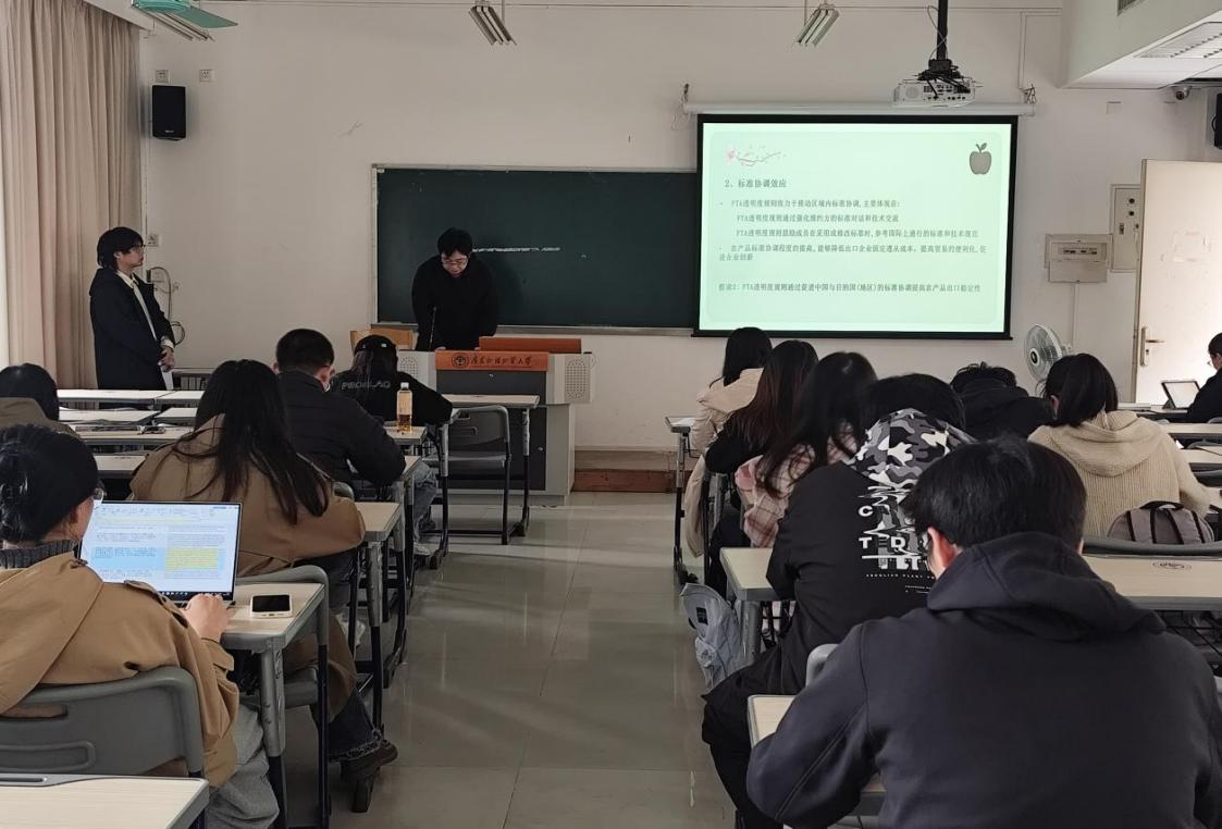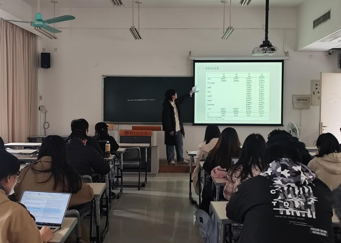 2025年11月20日下午14点,经贸学院2025年第13期(总第101期)国贸理经学术论坛在教学楼B座308顺利举行。本次论坛由经贸学院陈寰琦老师主持,由硕士研究生陈炜林、王泽坤、聂甜甜与朱婷进行汇报。本次论坛汇报了发表于《国际贸易问题》期刊2025年第1期的文章《自由贸易协定透明度规则对农产品出口稳定性的影响》(作者:张子琳、董银果)。该研究为中国维护农产品贸易稳定和推进高标准自由贸易区建设提供了参考,吸引了学院各级研究生的积极参与。