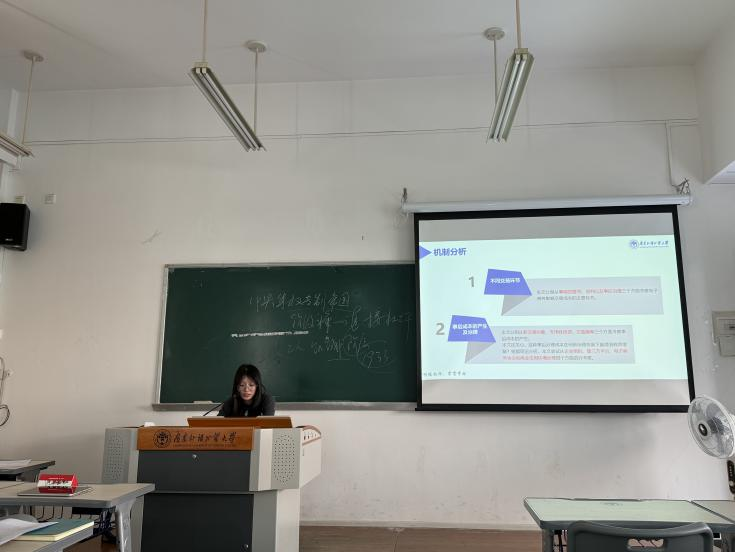 紧接着,刘欣仪同学深入解读机制分析与进一步讨论的核心内容。在机制分析环节,她首先剖析了电子商务对不同交易环节成本的影响:电子商务显著降低事前搜寻成本与谈判成本,但会因交易范围扩大、“陌生人”交易增加等因素提升事后治理成本。她进一步区分企业类型指出,对本地偏向型企业,电子商务降低搜寻成本的作用更突出;对异地偏向型企业,其降低谈判成本的效果更明显。关于事后治理成本,她强调该成本与新对象交易不确定性、专用性投资及交易频率相关,而企业组织、第三方平台、电子商务协会、商业信用环境四大治理机制可有效缓解这一问题。在进一步讨论中,她分享了电子商务的作用范围与渠道:不仅能拓展交易距离、强化省际边界跨越能力,还能从广延边际和集约边际双向促进跨地区交易,且对跨城市销售的促进作用优于跨城市采购;同时,电子商务能助力高行政壁垒地区企业突破本地锁定,也能帮助企业与高行政壁垒地区开展交易。