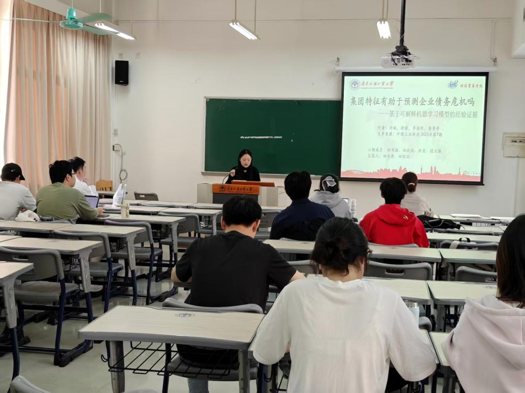 2025年12月11日16点,经贸学院国贸学术论坛2025年第16期(总期第104期)于教学楼B座308室举行。经贸学院何炜老师受邀担任本次论坛主持人,24级硕士研究生刘青和段文振、25级硕士研究生田欣怡和田书源组队汇报发表于《中国工业经济》2025年第7期的文章《集团特征有助于预测企业债务危机吗?--基于可解释机器学习模型的经验证据》。学院各级研究生同学积极参与本次文献研讨会议。