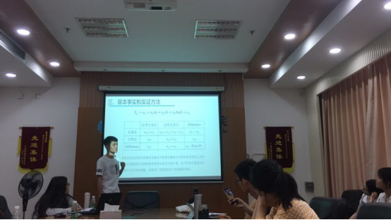 经济组汇报的题目是《出口退税政府间分担对产品出口的影响》,主讲人为2017级财政学的郭攀同学以及2018级财政学的欧嘉丽同学。主要分析了2004年出口退税政策对于税收负担不同的省份以及不同所有制类型企业产品出口的影响,证明了在出口退税由中央和地方共同负担的条件下,高负担的省份对于一般贸易产品的出口具有抑制作用,而且主要作用在存续企业;此外还证明了外资企业所受影响最大。