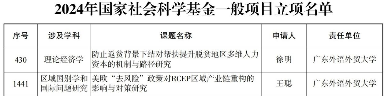近日,2024年国家社会科学基金年度项目立项名单发布,我院共获批1项重点项目、2项一般项目、1项青年项目,获批立项项目数量位居全校第一。其中我院张志明教授的项目《高标准区域贸易协定对亚太产业链韧性的影响机制与中国对策研究》获全校唯一一项重点项目立项。同时,徐明教授的项目《防止返贫背景下结对帮扶提升脱贫地区多维人力资本的机制与路径研究》与王聪博士的项目《美欧“去风险”政策对RCEP区域产业链重构的影响与对策研究》获一般项目立项,明元鹏博士的项目《经济安全视角下数字货币的国家监管与全球治理研究》获青年项目立项。这是我院继国家自科基金项目成功立项1项后,在国家级项目等高层次成果领域取得的又一重要突破,标志着我院在该领域研究水平的稳定提升。