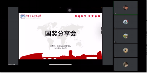 为进一步加强学风建设,充分发挥优秀学生的榜样引领作用,助力2021级同学规划学业、明确目标,经贸学院于10月13日晚上20点在线上组织开展了“对话国奖,见贤思齐”优秀师兄师姐经验分享会,本次会议由国贸2104班江佳蓓主持,参加本次会议的嘉宾有辅导员黄燕平、尹浩楠,2019级财政学童一舟、2019级国贸李东昕和2020级税收学邓有为。