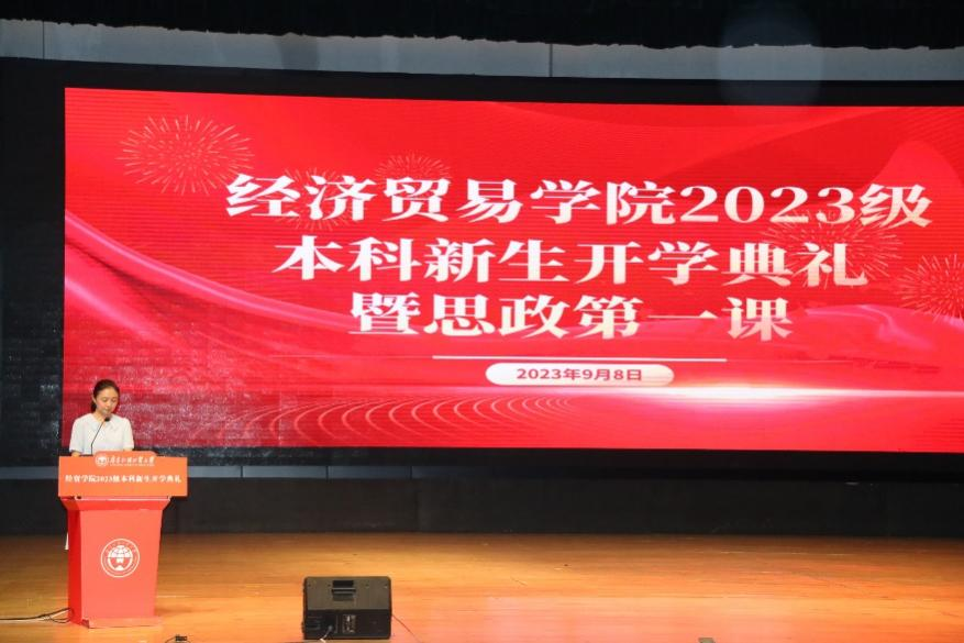 经济贸易学院2023级本科新生开学典礼暨思政第一课于9月8日上午在南校区大会堂隆重举行。学院院长孙楚仁、学院副院长张志明、学院副院长官华平、学院党委副书记陈思、教师代表徐明、全体辅导员、老生代表陈冠雲、新生代表黄煜皓及全体2023本科新生等出席开学典礼。典礼由学院党委副书记陈思主持。