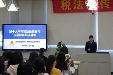授牌仪式过后,进入到活动的下一重要流程:税法宣讲。白云区税务局干部郑洁燕上台为大家针对新个人所得税法政策进行宣传,她先从专项附加扣除政策说起,将其分成子女教育、继续教育、住房贷款利息、住房租金、赡养老人和大病医疗六个子项目,再分别针对它们各自的享受条件、标准方式、起止时间、备查条件和案例进行详细的说明和介绍。除此之外,她还介绍了专项附加扣除的办理途径和新增的扣缴权利与义务等内容,结合贴近同学们生活的例子,在赢得满堂喝彩的同时形象而又淋漓尽致地将相关知识传授给了同学们。
