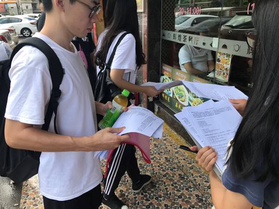 他们深入到街头与巷里,将一份份问卷派发下去,他们礼貌的微笑与话语,在街坊心目中树立的良好的大学生形象,并让街坊们积极地填写问卷进行反馈。今天的调研组,同样也是满载而归!