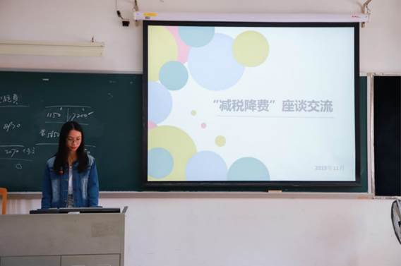 座谈会主要分为三个环节,第一个环节由七个小组通过制作PPT分别展示他们对“减税降费”政策实施的理解。展示完毕后,由后一组同学对前一组展示内容进行了点评及提问。