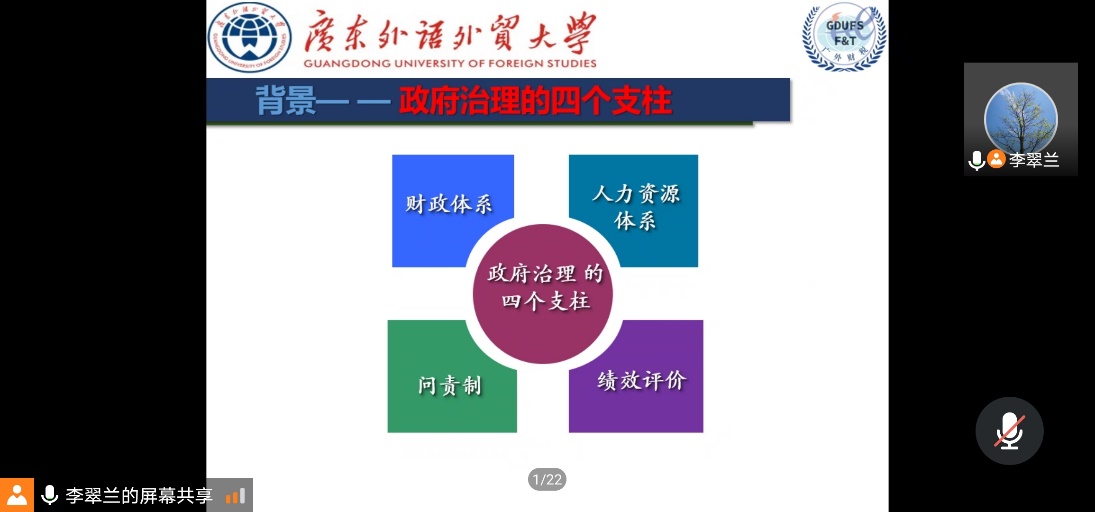 首先,李翠兰老师开篇明确政府治理的四个治理支柱为财政体系、人力资源体系、绩效评价和问责制,其中,今天讲座的主题将是围绕政府财政体系介绍目前的绩效评价体系。