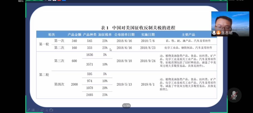 在讲座上,张志明博士介绍了中国对美国征收反制关税的进程。中国对美国征收反制关税的过程分为两轮,第一轮反制关税主要产品有农、牧、副、渔产品、化学工业钢铁制品、汽车及零附件等。第二轮是动植物及油脂类产品、食品、纺织类、矿产品等涵盖了5207种商品。