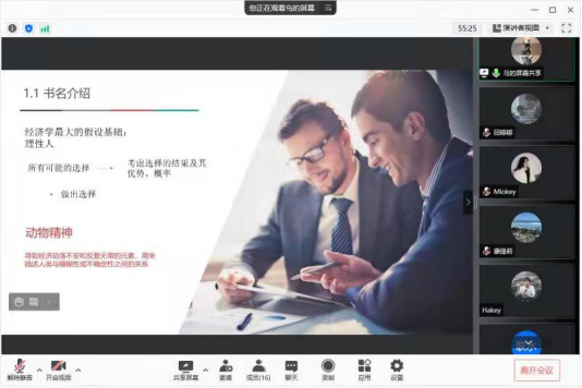 其间,康老师和李老师也充分从自身经验和学识旁征博引,表达了对于这几本书的探讨,也不乏与现实的结合,比如由“冲突”联系当下中美冲突的影响与原因,同时也推荐了《非理性繁荣》、《身份政治:对尊严与认同的渴求》等相关书籍为同学们开阔视野。最后本次线上读书会也到此圆满结束,也期待下一次与同学们的再次相遇。