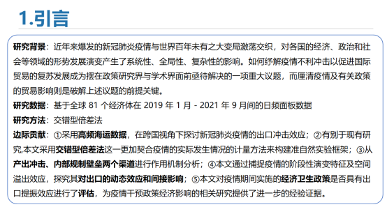 刘副教授从研究背景引入,以疫情发展与贸易发展两个角度介绍写作背景,阐明当今世界研究的不足,并由此切入课题的研究。他详细地阐述了研究方法、参考文献和边际贡献,指出研究的理论与实践意义是促进流行病学的研究,为贸易政策实践提供学理、决策参考依据