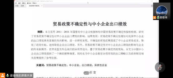 梁俊伟老师首先介绍了研究背景:全球贸易中出现动荡,作为进出口的主力军,中国中小企业发展不确定因素多,抗风险能力弱。其次,介绍了贸易不确定性的概念以及贸易不确定性的测度。贸易不确定性的测度主要有三种方法:文本提取法、关税差值法、模型估计法。再次,梁俊伟老师通过严密的公式推导证明,贸易不确定性是企业出口额和出口利润的减函数。基于此提出假说:贸易不确定性下降有利于提升中小企业的出口绩效。贸易政策的不确定性下降可能降低企业的贸易成本,减少政府补贴,进而影响中小企业的出口绩效,并运用实证模型,例如基准回归模型证明以上假说。最后,梁俊伟老师提出具体措施,例如:政府应该保持宏观政策的透明、连续和稳定,从源头减少贸易政策的不确定性。我国可借势“一带一路”,加强同贸易伙伴国之间的互联互通,提高投资便利化水平,有效降低企业的出口贸易成本。政府应该重视补助作用,增强对中小企业的扶持,改善中小企业经营环境等。