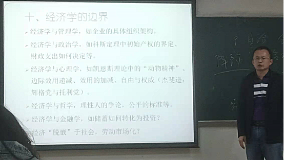 然后,魏教授又进一步提出了经济学的边界,它与管理学,政治学,心理学都有各自不同的研究领域,但它们又是互相促进的。同时,他又提出关于经济学与政治经济学的关系,宏观经济学和微观经济学是不可分割的等观点。在此期间,又接连给我们介绍了休谟悖论和降阶思维,令同学们茅塞顿开。