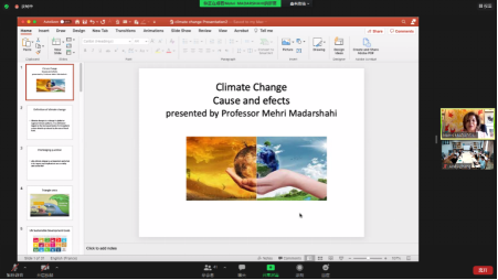 本网讯 7月7日下午,经贸学院邀请我校新聘客座教授Mehri Madarshahi(梅里·马达沙希)举办题为“SDGs and the challenges of climate change”学术讲座。经贸学院副院长唐静老师、昆士兰项目负责人张晶晶老师、MIB教育中心主任朱文珏老师、国际合作秘书卢姗姗老师以及四十余名学生参会,本次讲座通过线上线下相结合的方式进行。讲座由张晶晶老师主持。